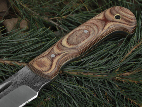 Рукоять ножа выполнена из бакелитовой фанеры – легкого и стойкого материала из слоев натурального березового шпона и бакелитовой бумаги. За высокую влагостойкость этот материал называют «морской фанерой»: он не намокает, не набухает и не расслаивается под действием воды, не подвержен гниению и плесени, что делает его удобным для работы при высокой влажности и частых осадках.