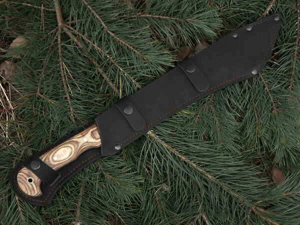 К изделию прилагаются ножны из натуральной кожи с подвесом для ношения на поясе и кнопочными хлястиками, страхующими от потери. Нож в таких ножнах плотно упакован, удобен в переноске, не вываливается и не болтается при тряске. Кожа окрашена в черный цвет, аккуратно проклепана и прошита, хорошо держит форму и приятна на ощупь.