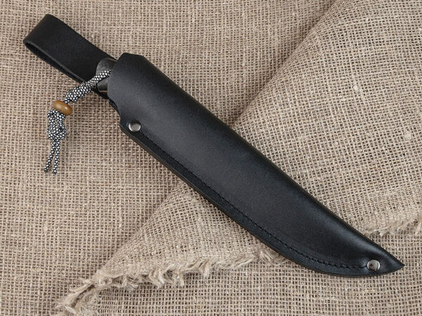 К изделию прилагаются ножны из натуральной кожи с фиксированным и свободным подвесом. Нож входит в них глубоко, клинок сидит плотно, не болтается при тряске. Кожа окрашена в черный цвет, аккуратно проклепана и прошита, хорошо держит форму и приятна на ощупь.