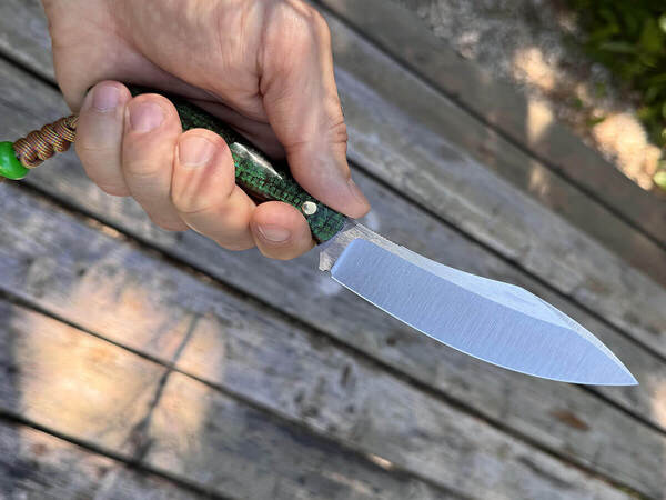 Нож «Канадец» выглядит стильно и сразу выделяется среди других ножей. Его форма острая и угловатая, а лезвие широкое и похоже на коготь хищного животного. Крутая горбинка на обухе резко сужается к острию и образует граненый «клюв».