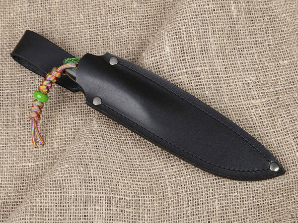 К изделию прилагаются ножны из толстой натуральной кожи с фиксированным и свободным подвесом. Нож входит в них глубоко, клинок сидит плотно, не болтается при тряске. Кожа окрашена в черный цвет, аккуратно проклепана и прошита, хорошо держит форму и приятна на ощупь.