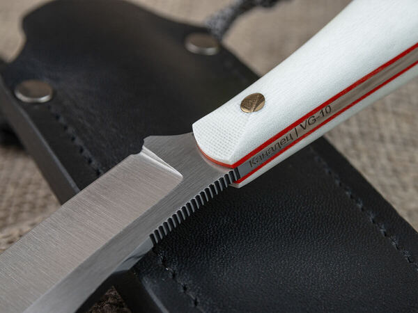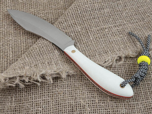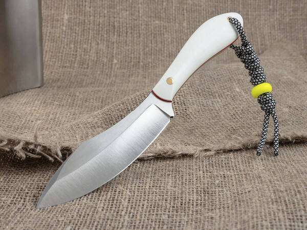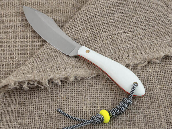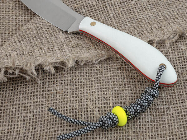 «Канадец» имеет необычный силуэт с листовидным клинком, поставленным под углом к рукояти. Снежная белизна накладок, подчеркнутых красным спейсером, делает нож особенно красивым и легко заметным на природе.