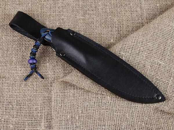 К изделию прилагаются ножны из толстой натуральной кожи с фиксированным и свободным подвесом. Нож входит в них глубоко, клинок сидит плотно, не болтается при тряске. Кожа окрашена в черный цвет, аккуратно проклепана и прошита, хорошо держит форму и приятна на ощупь.