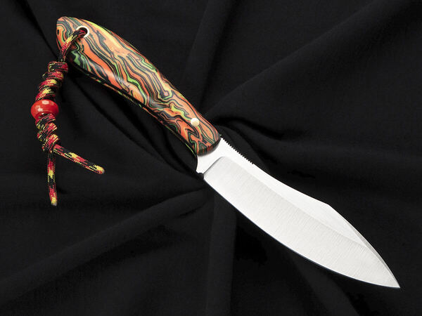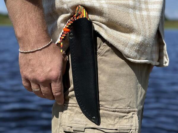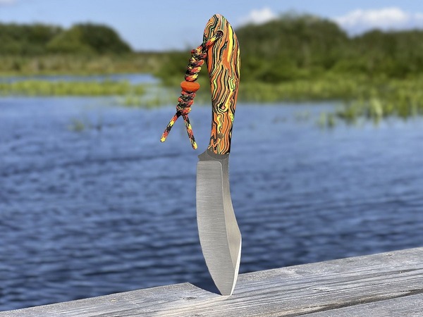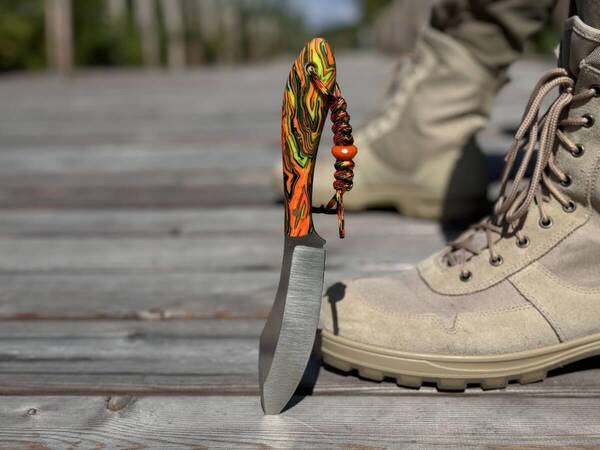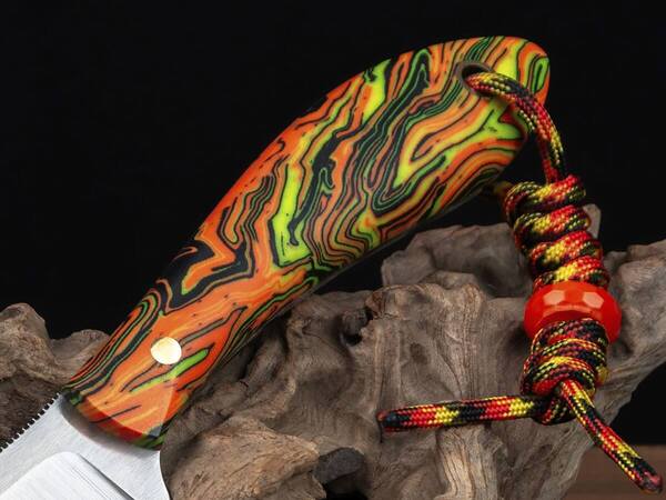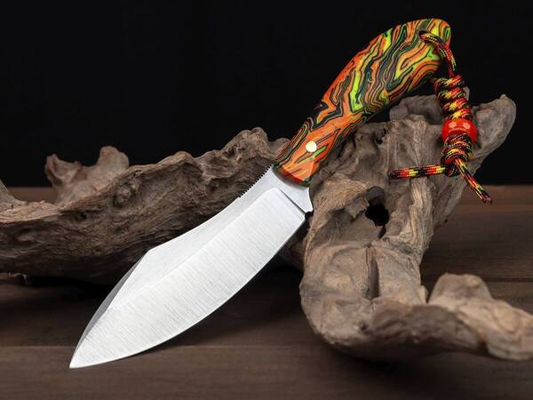 Рукоять имеет сочный салатово-оранжевый окрас и напоминает лучи солнца, пробивающегося сквозь молодой лес: эта броская гамма помогает ножу не затеряться среди листьев и травы. Таким стильным ножом можно похвастаться на привале у охотничьего костра: его яркий и дерзкий вид говорит сам за себя.
