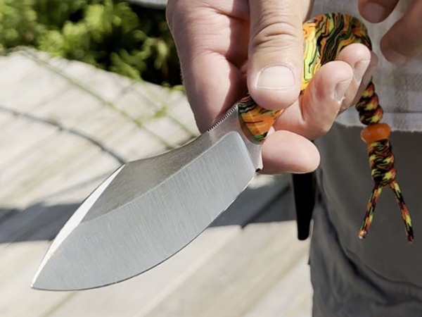 Необычный дизайн «Канадца» резко выделяет его среди других клинковых инструментов. Силуэт модели подчеркнуто острый и угловатый, расширенный клинок напоминает коготь хищного зверя, а волнистый обух с крутой горбинкой резко сходит к острию, образуя граненый «клюв».