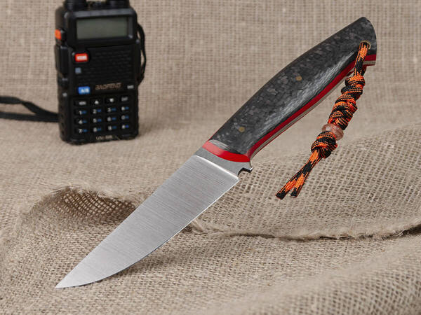 Модель с красным спейсером выглядит стильно и эффектно – кажется, что на рукоять попала струйка крови. Яркий как огонь темляк виден издалека и поможет не потерять нож в траве и среди веток.