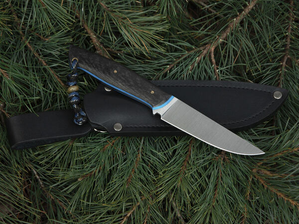 К изделию прилагаются ножны из натуральной кожи с фиксированным и свободным подвесом. Нож входит в них глубоко, клинок сидит плотно, не болтается при тряске. Кожа окрашена в черный цвет, аккуратно проклепана и прошита, держит форму и приятна на ощупь.