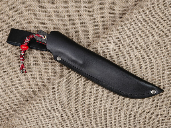 К изделию прилагаются ножны из натуральной кожи с фиксированным и свободным подвесом. Нож входит в них глубоко, клинок сидит плотно, не болтается при тряске. Кожа окрашена в черный цвет, аккуратно проклепана и прошита, держит форму и приятна на ощупь.