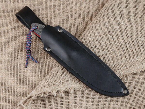 К изделию прилагаются ножны из толстой натуральной кожи с фиксированным и свободным подвесом. Нож входит в них глубоко, клинок сидит плотно, не болтается при тряске. Кожа окрашена в черный цвет, аккуратно проклепана и прошита, хорошо держит форму и приятна на ощупь.
