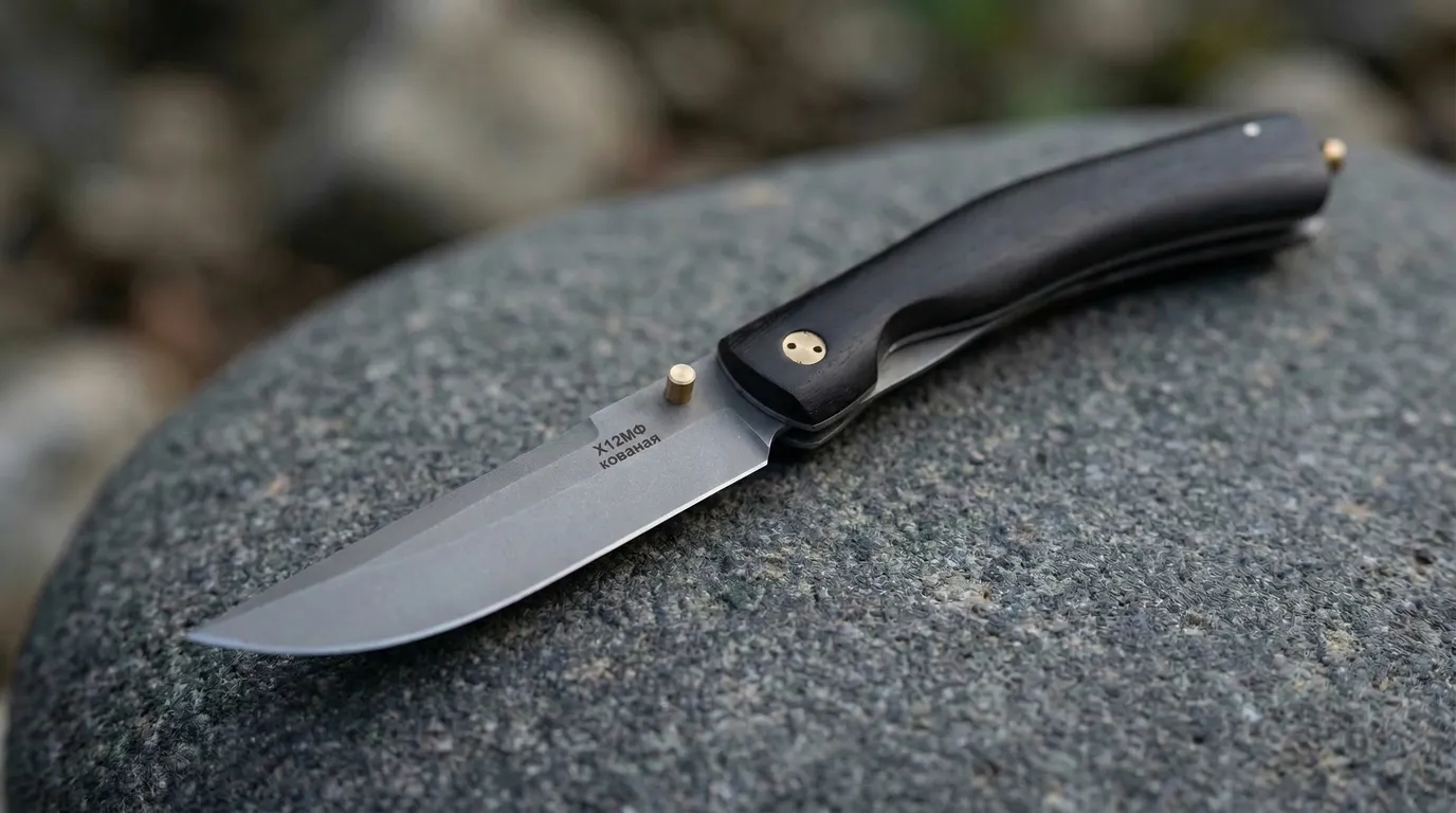 Компактный складной нож «Гриф» ручной работы с клинком из кованой стали Х12МФ и рукоятью из чёрного граба. Нож отлично держит заточку, а складная конструкция делает его практичным для повседневных задач.