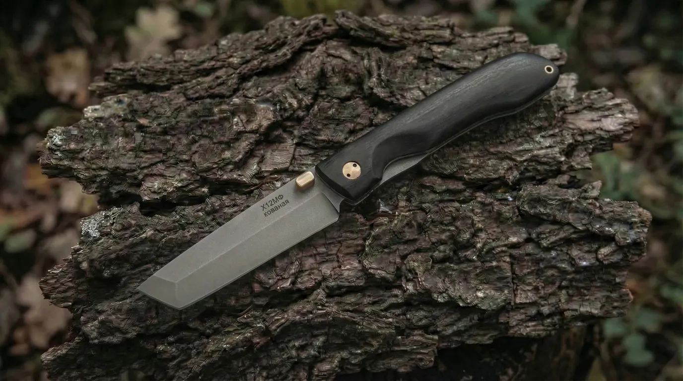 Клинок изготовлен из прочной кованой стали Х12МФ с твёрдостью 60–61 HRC. Ножи из такой стали долго держат заточку, поэтому ее широко используют в изготовлении охотничьих ножей.