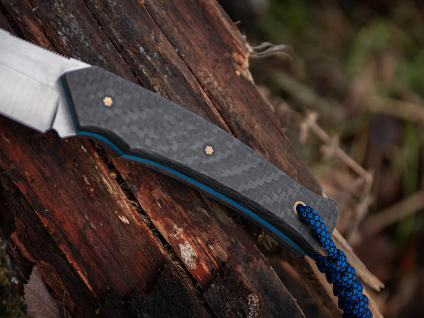 Карбоновую рукоять оживляет яркий ободок цвета неба – это улучшает эстетику ножа и помогает ему не затеряться среди зелени.