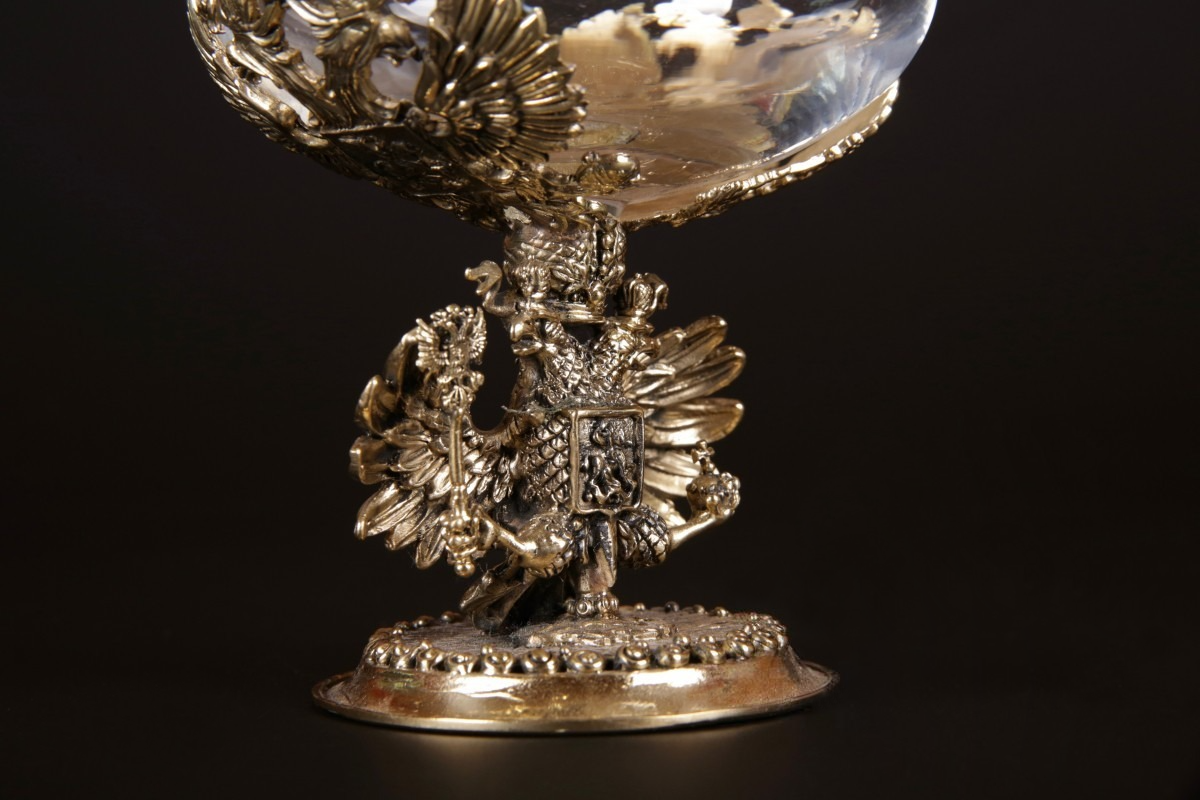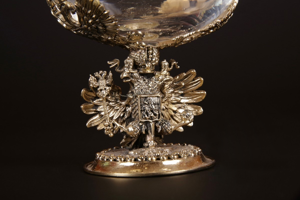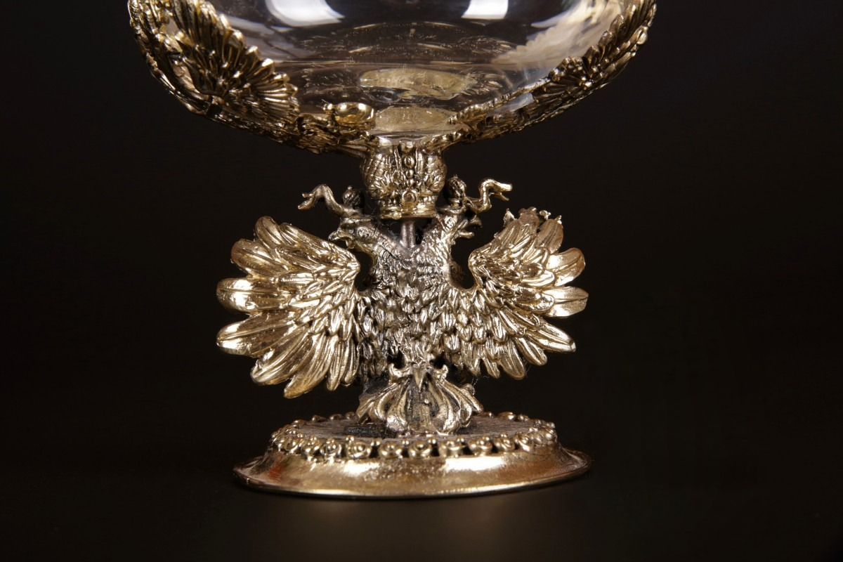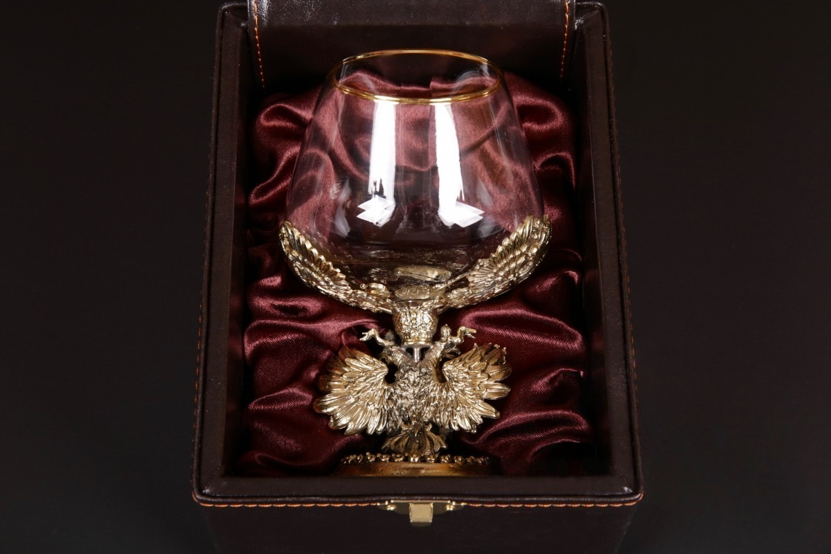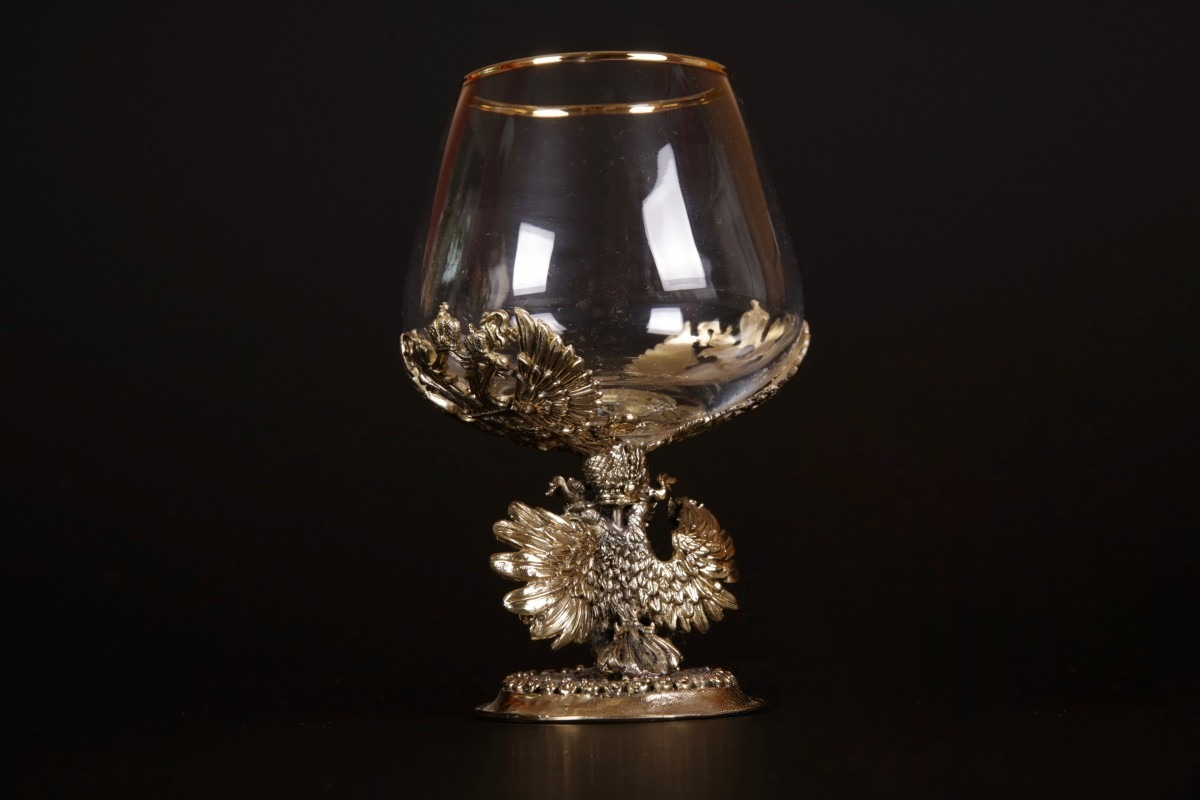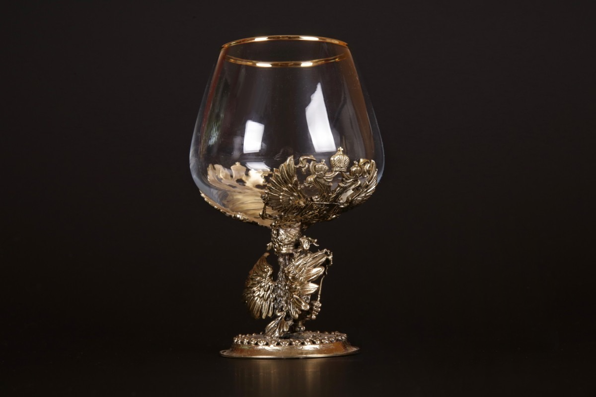 Ножка бокала, выполненная методом художественного литья из латуни, изображает двуглавого орла, имеет идеальную детализацию и прорисовку всех элементов. Оцените мастерство автора, который передал в металле мельчайшие детали.