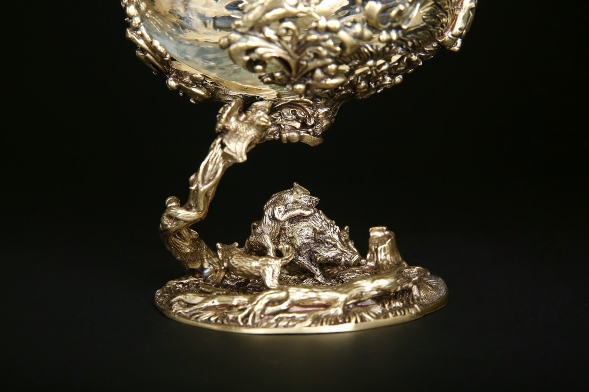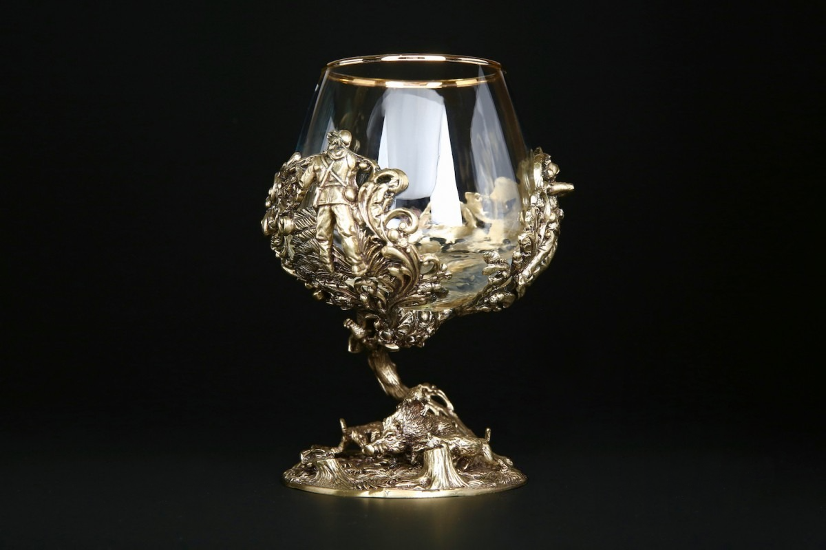 Ножка бокала, выполненная методом художественного литья из латуни, изображает охоту на кабана, имеет идеальную детализацию и прорисовку всех элементов. Оцените мастерство автора, который передал в металле мельчайшие детали.