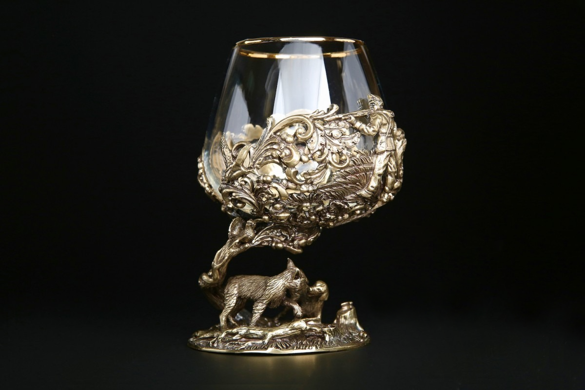 Ножка бокала, выполненная методом художественного литья из латуни, изображает охоту на рысь, имеет идеальную детализацию и прорисовку всех элементов. Оцените мастерство автора, который передал в металле мельчайшие детали.