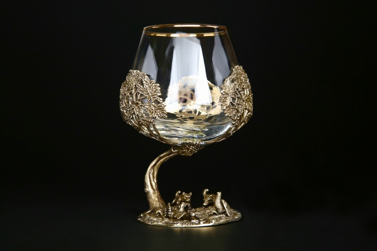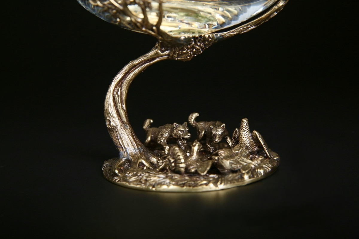 Ножка бокала, выполненная методом художественного литья из латуни, изображает глухаря, имеет идеальную детализацию и прорисовку всех элементов. Оцените мастерство автора, который передал в металле мельчайшие детали.