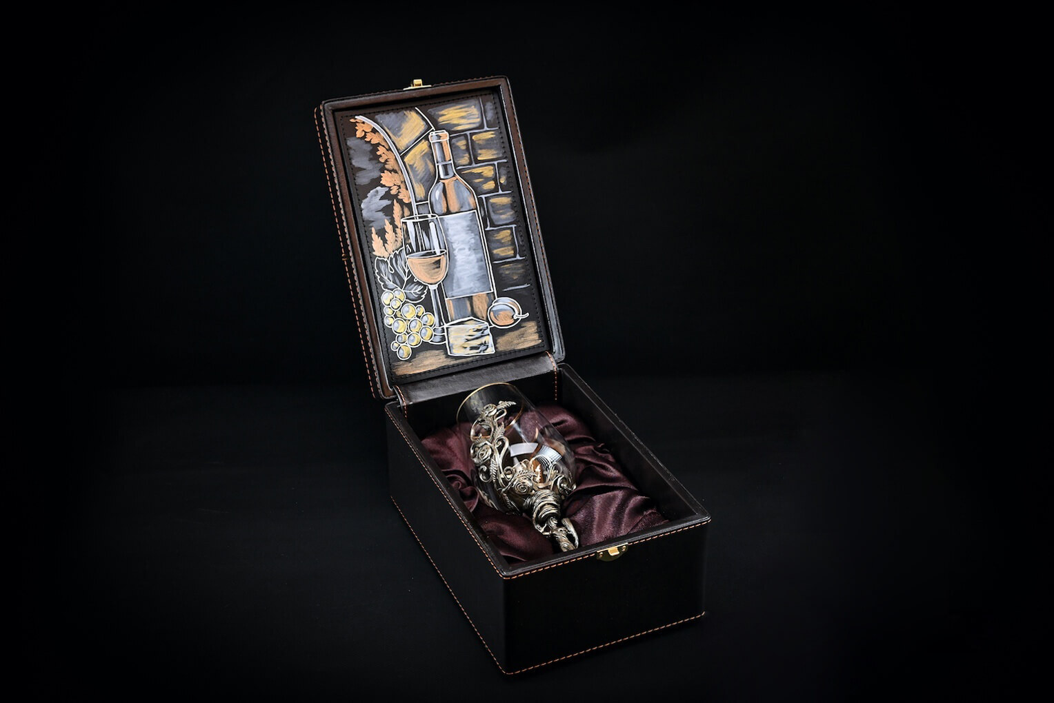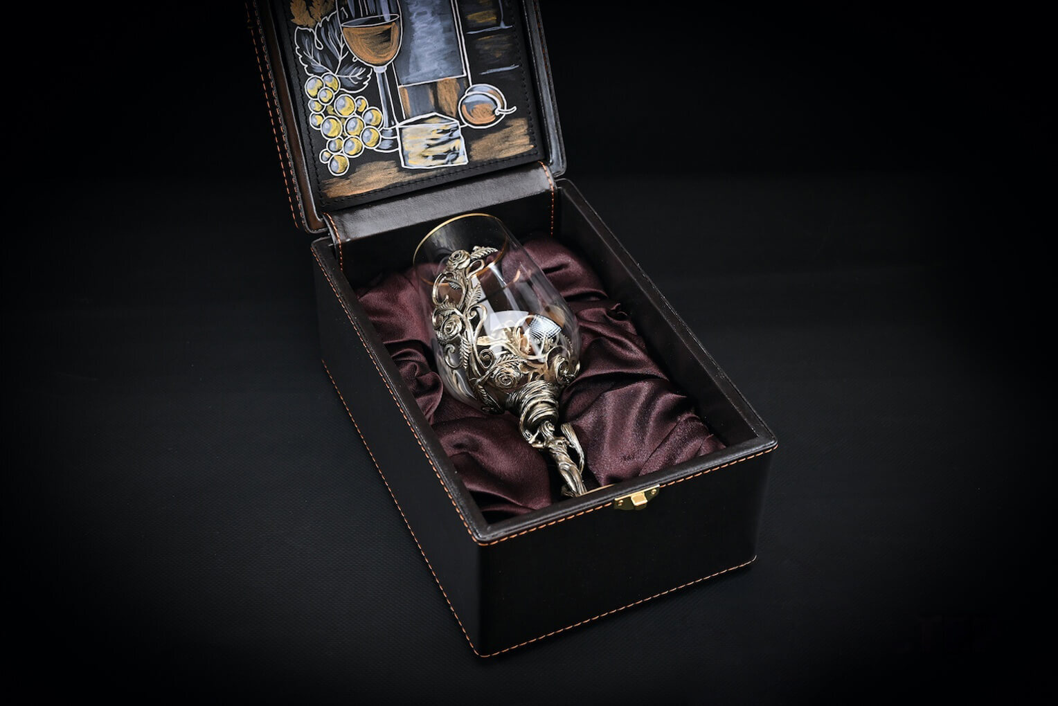 Авторские бокалы для вина поставляются в стильном кейсе, подчеркивающим роскошь комплекта: элегантная эко-кожа снаружи и красный бархат - внутри.