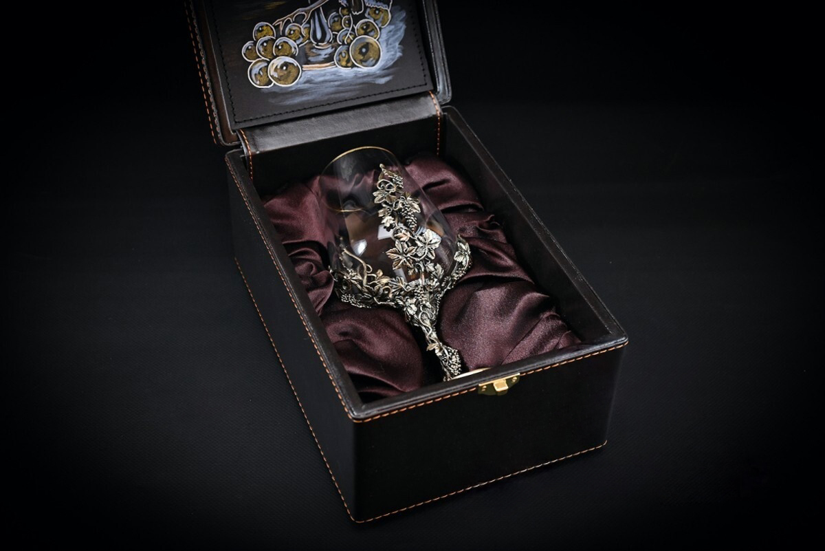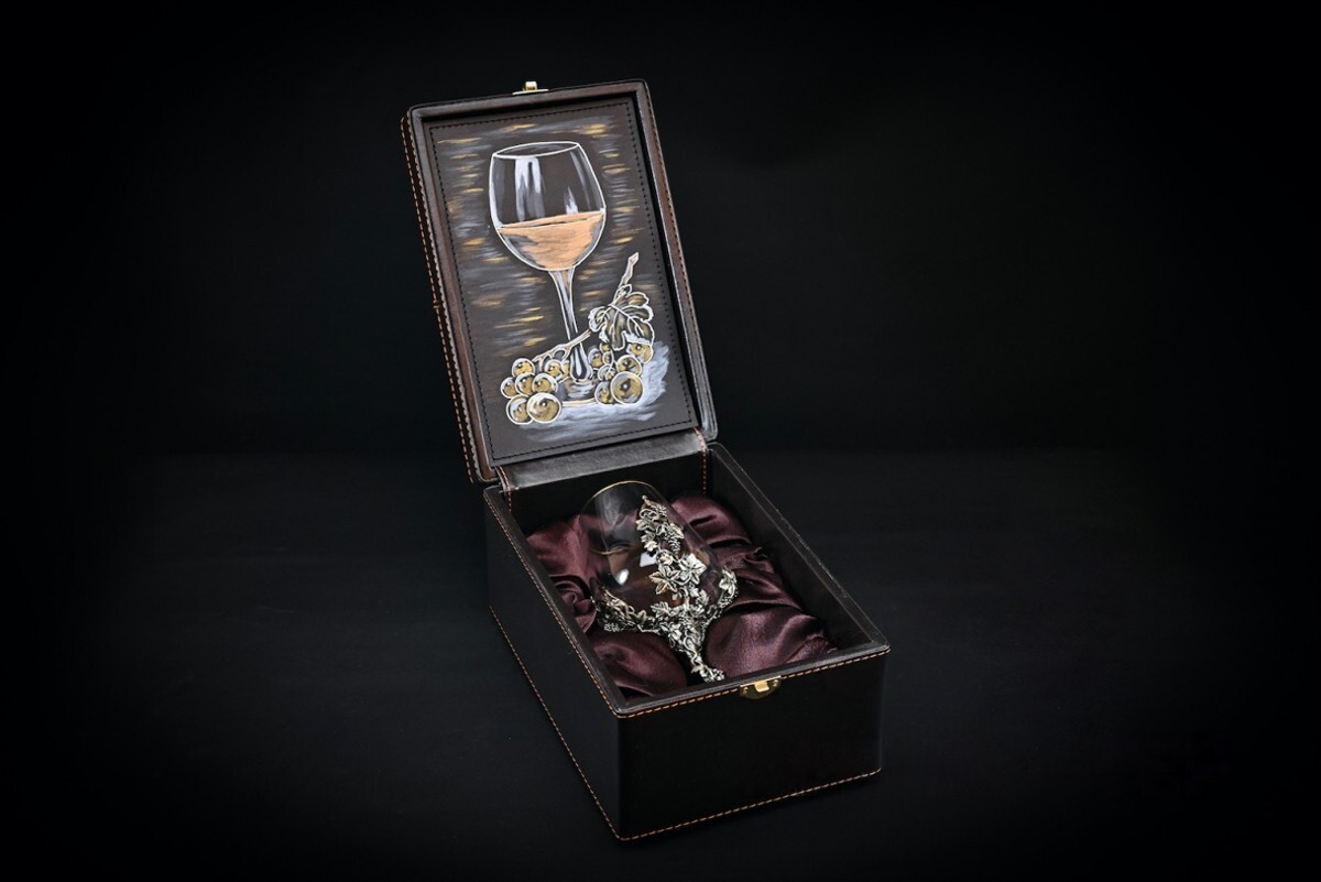 Авторские бокалы для вина поставляются в стильном кейсе, подчеркивающим роскошь комплекта: элегантная эко-кожа снаружи и красный бархат - внутри.