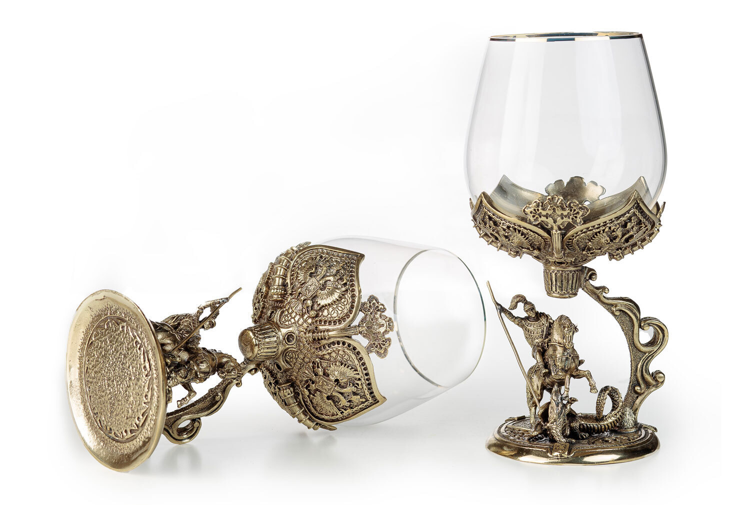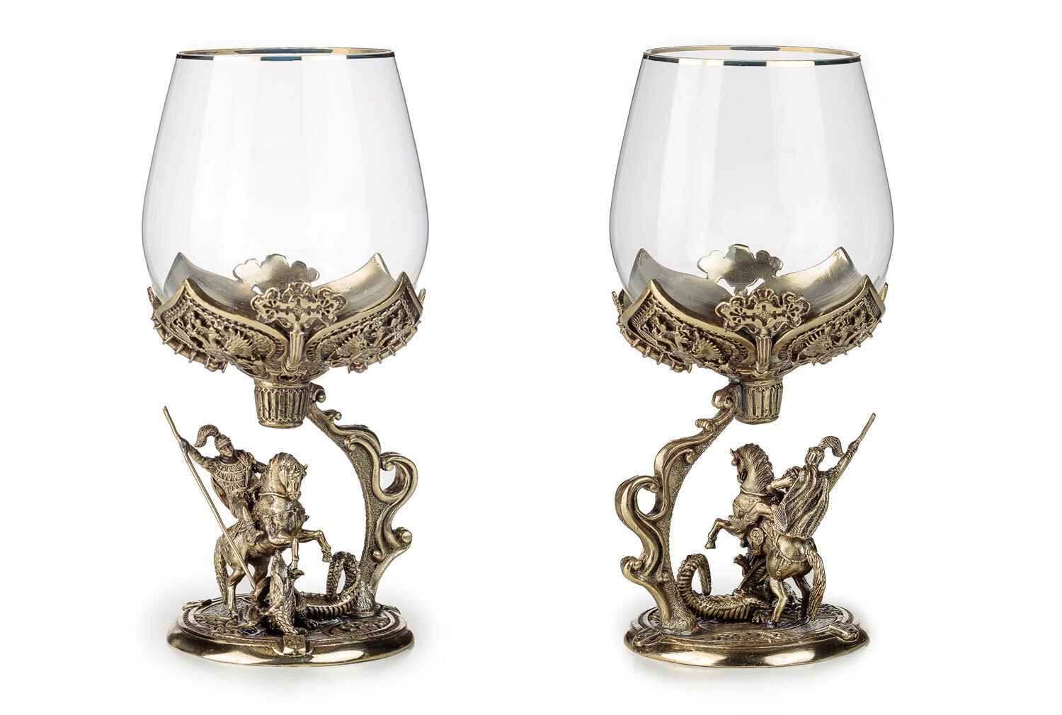 Георгий Победоносец на своем верном коне, копьём побеждает змея. Такую композицию, выполненную вручную в технике художественного литья можно увидеть на бокале для коньяка.