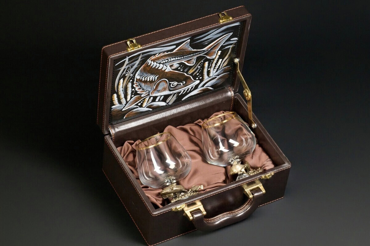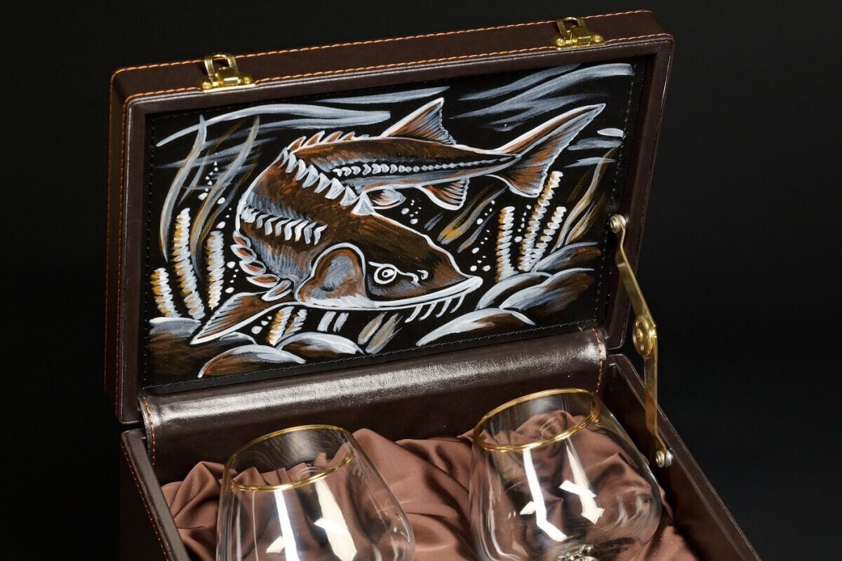 Данный набор бокалов укомплектован подарочным футляром из эко-кожи с художественным оформлением, с благородной контрастной отстрочкой и ложементом из бархата. Рисунок наносится художником вручную.