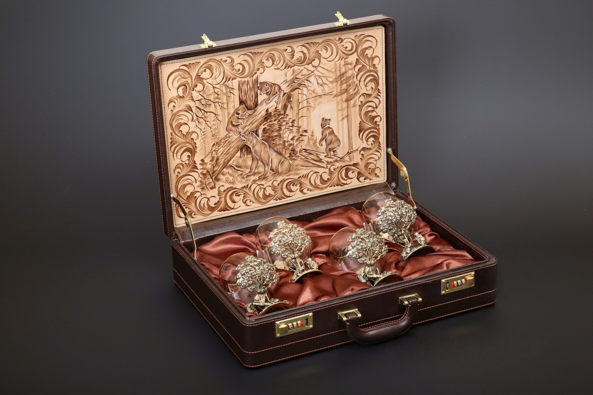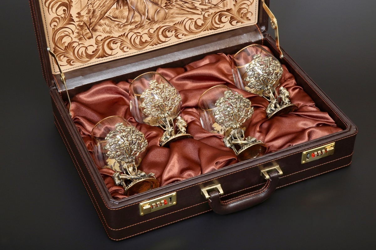 При желании можно укомплектовать данный набор бокалов подарочным футляром из эко-кожи с художественным оформлением, с благородной контрастной отстрочкой и ложементом из красного бархата. Рисунок наносится художником вручную.