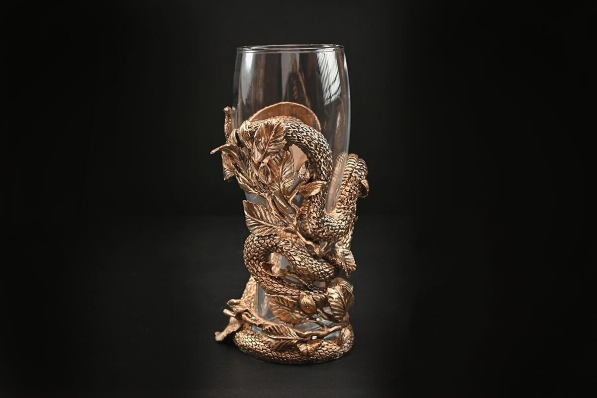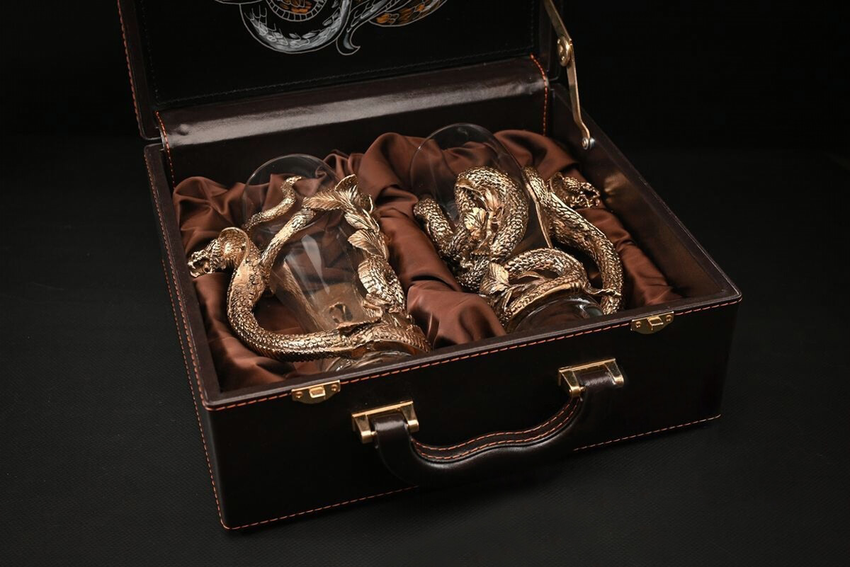 Художественная часть бокалов выполнена из латуни, имеет идеальную детализацию и прорисовку всех элементов. Оцените мастерство автора, который передал в металле мельчайшие детали.