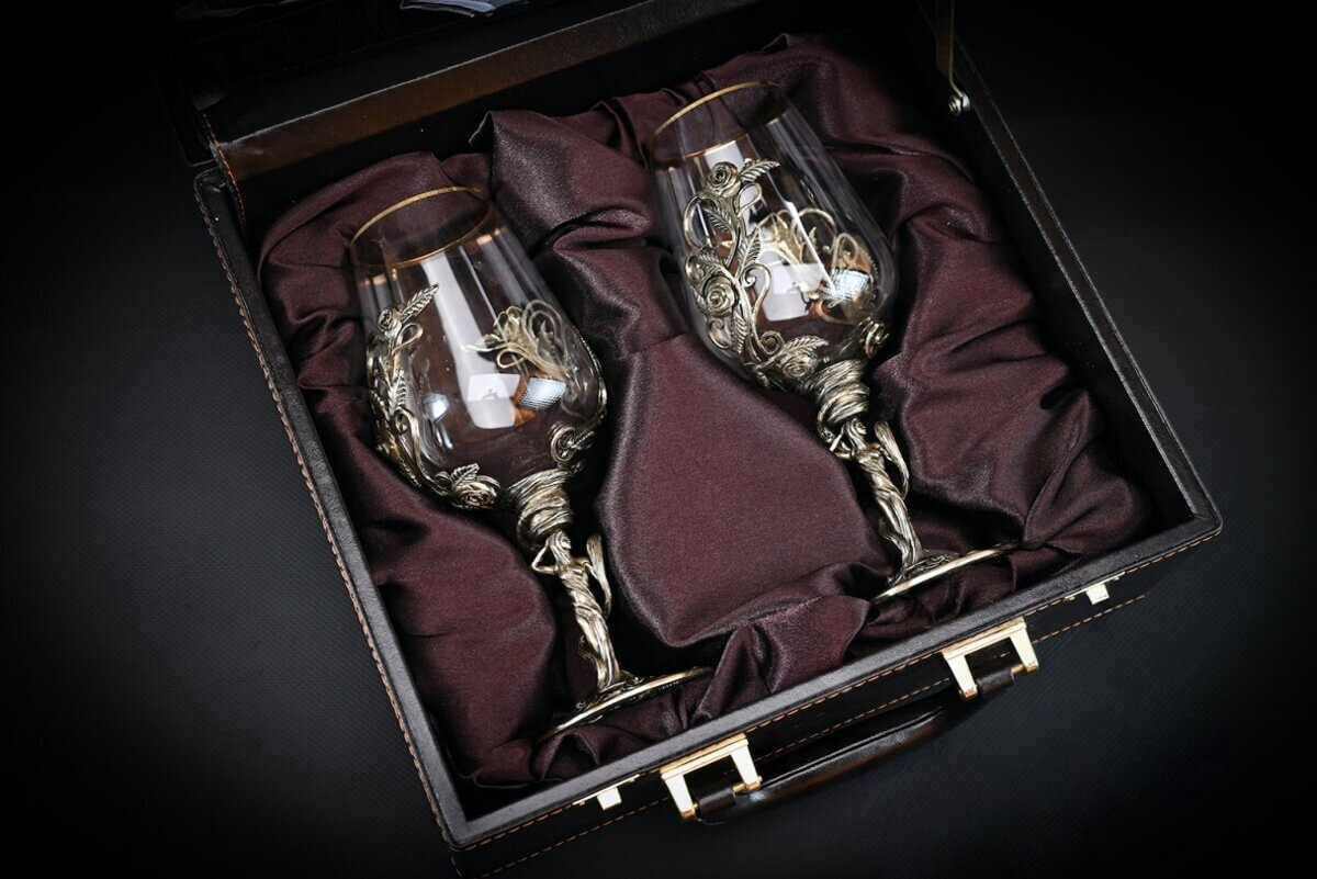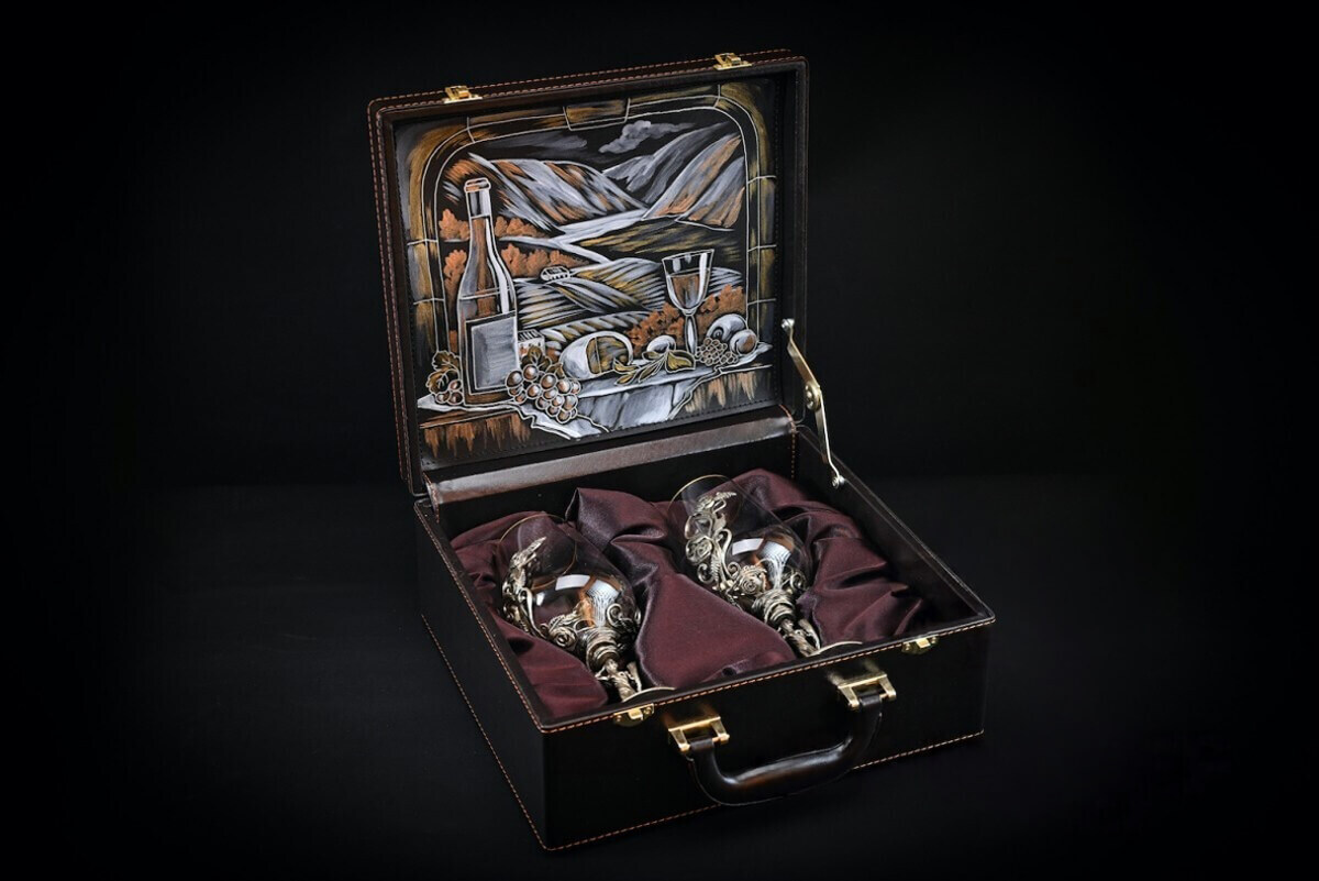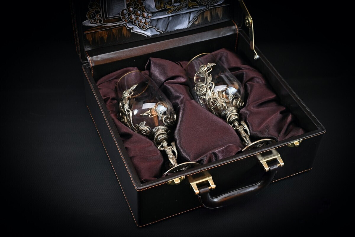Авторские бокалы для вина поставляются в стильном кейсе, подчеркивающим роскошь комплекта: элегантная эко-кожа снаружи и красный бархат - внутри.