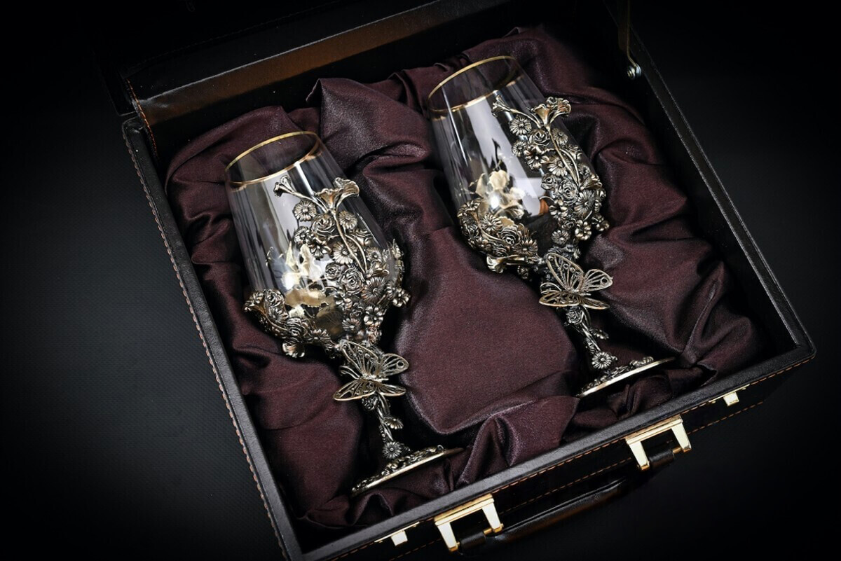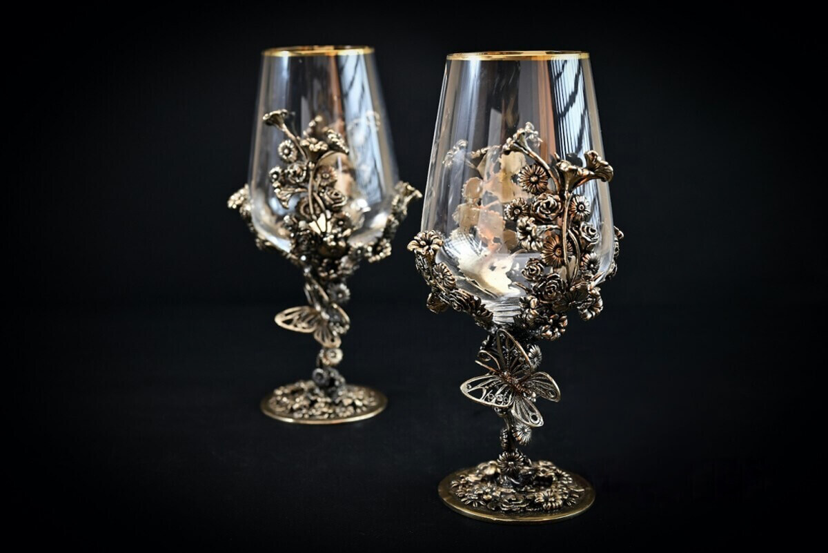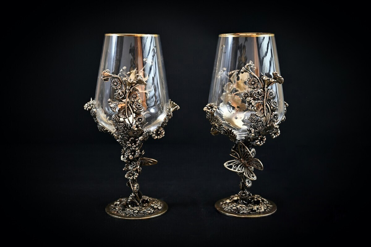 Каждый бокал уникальное авторское изделие. Необычный декор, выполненный методом художественного литья, восхищает и завораживает свой ажурной красотой.