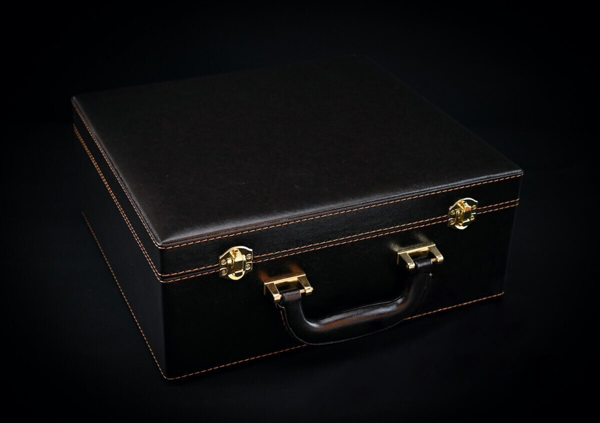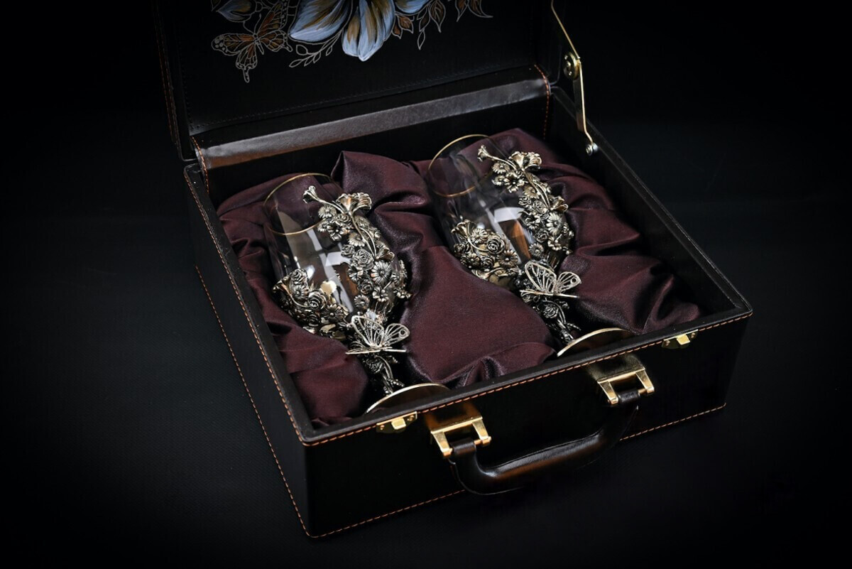 Авторские бокалы для вина поставляются в стильном кейсе, подчеркивающим роскошь комплекта: элегантная эко-кожа снаружи и красный бархат - внутри.