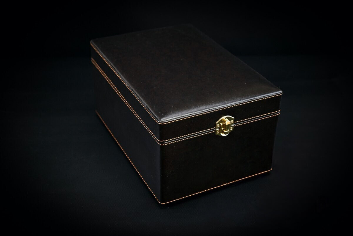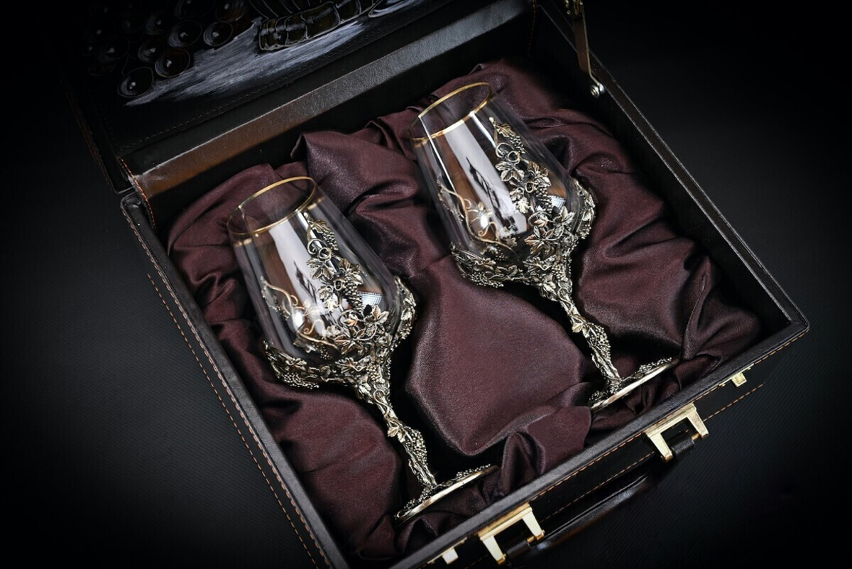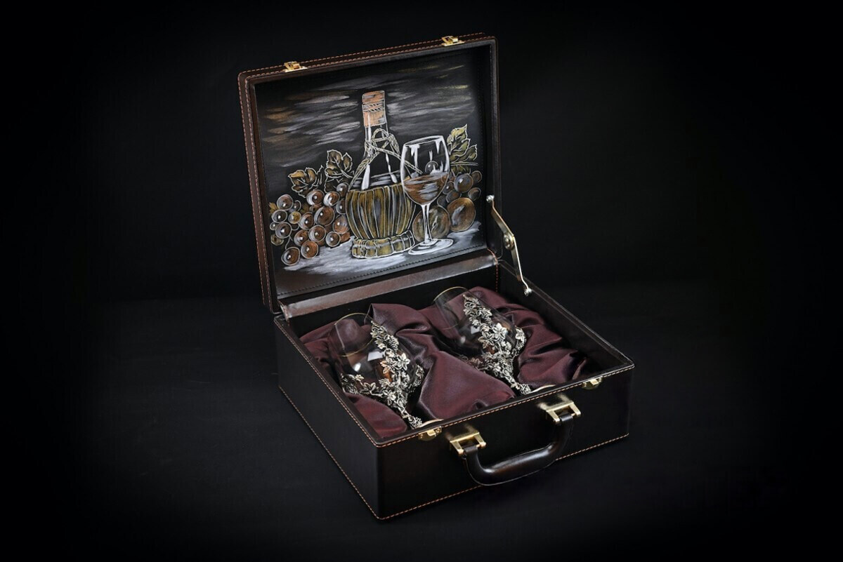 Авторские бокалы для вина поставляются в стильном кейсе, подчеркивающим роскошь комплекта: элегантная эко-кожа снаружи и красный бархат - внутри.
