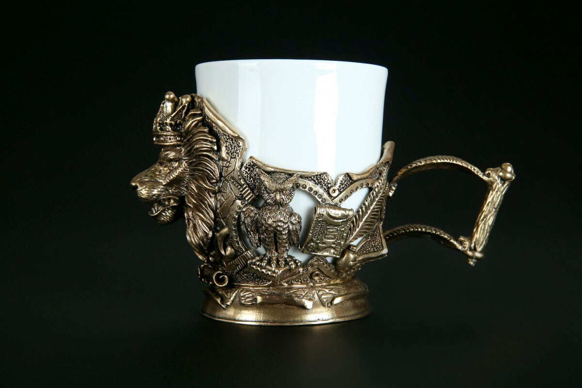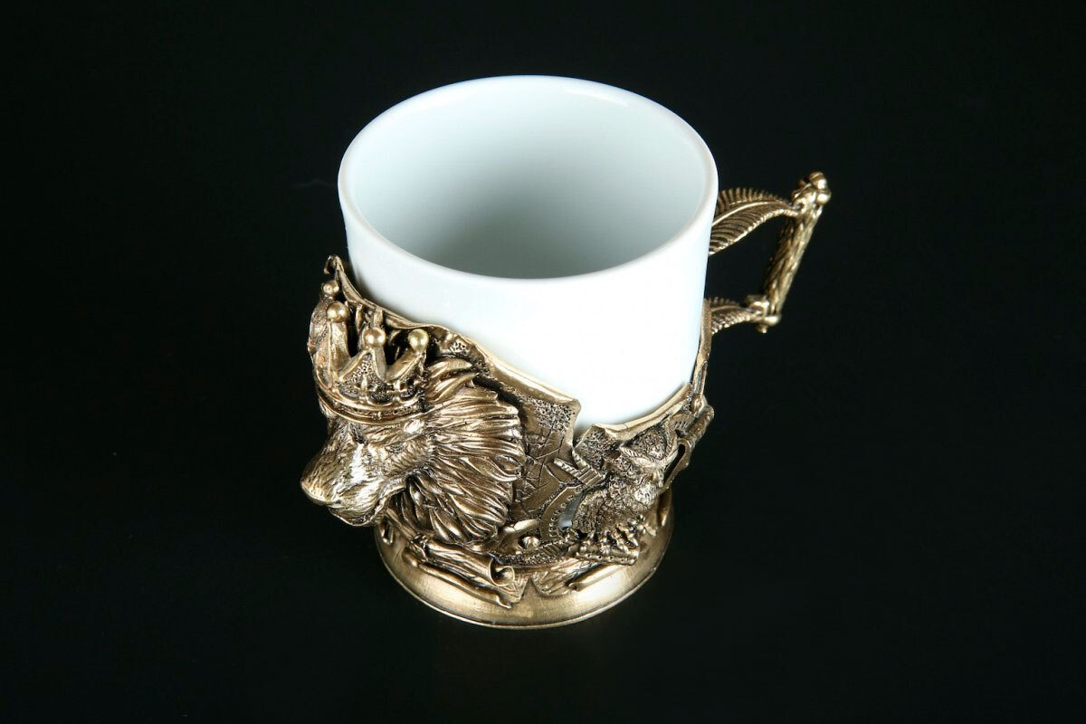 Основа чашки выполнена из керамики – материала, который хорошо удерживает тепло и комфортен в использовании. Декоративная часть изготовлена методом художественного литья из латуни.