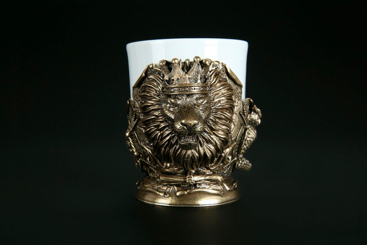 Металлическая композиция проработана детально: фактура гривы, элементы короны и дополнительные декоративные детали выполнены аккуратно и точно. Все элементы читаются и формируют цельный образ. Металл и керамика образуют контраст, за счёт которого чашка выглядит выразительно и дорого.