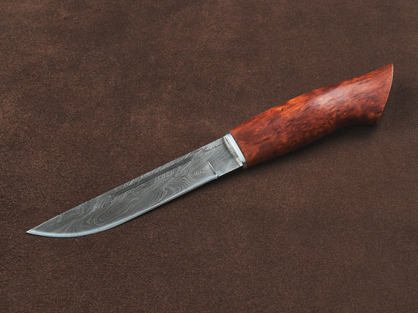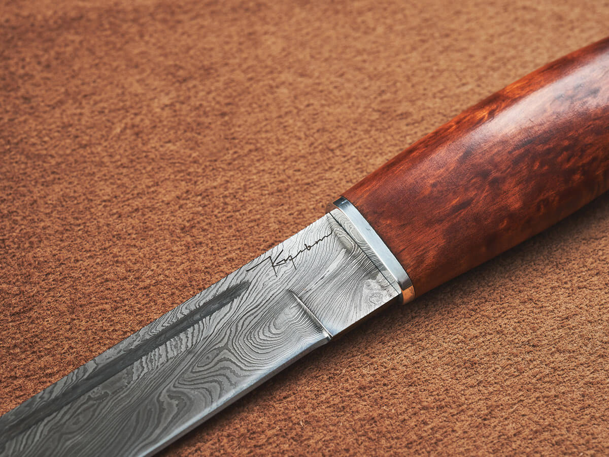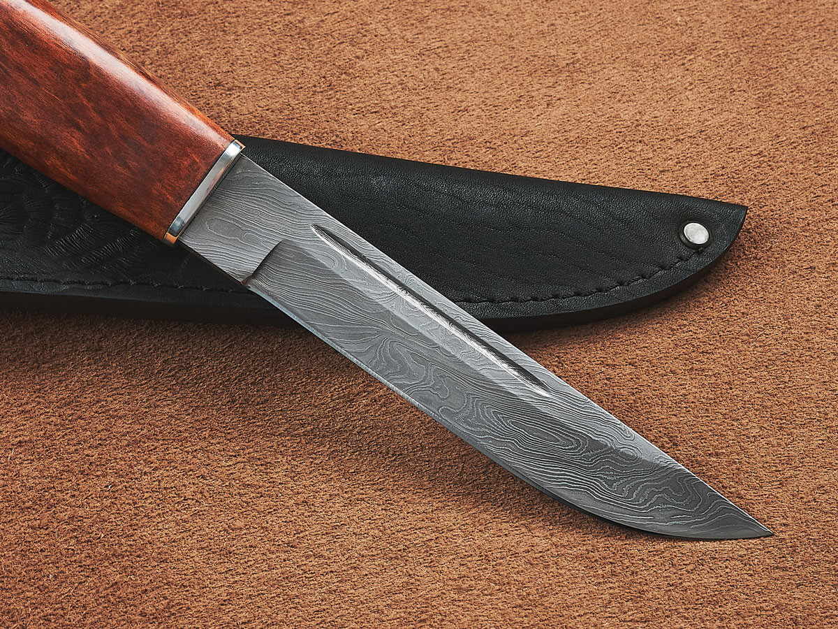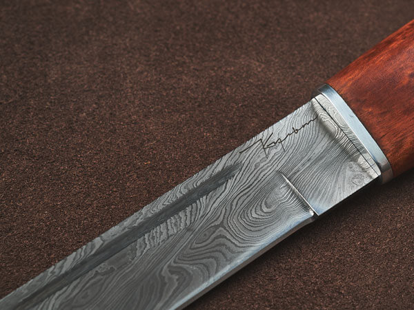 Клинок изготовлен из дамасской стали, что гарантирует его высокую прочность и исключительную остроту. Дамасская сталь не только крепче обычной, но и более износостойкая и декоративно более выигрышная за счет уникального узора. В основу поковки входят четыре марки качественной стали: У8А, ШХ-15, 5ХНМА и 45х13. Твердость клинка после закалки составляет 60 единиц HRC. Микро-подвод на лезвии максимально острый – 0,3 мм, а режущая кромка образует тончайшую микро-пилу благодаря тому, что в дамасской стали чередуются слои металла с низким и высоким содержанием углерода (всего таких слоев около 400).