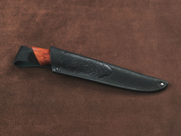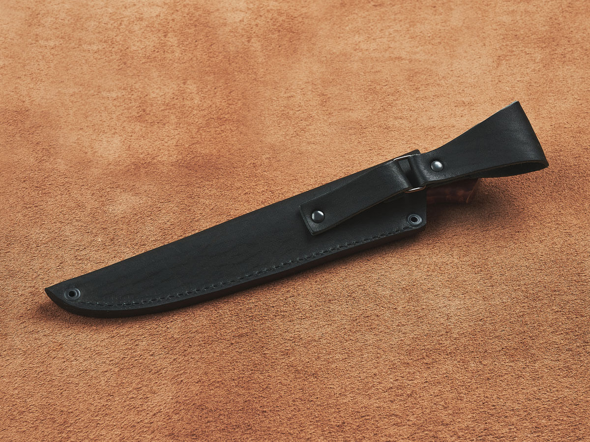 Прилагаемые к изделию ножны классической формы, сделаны из толстой натуральной кожи и снабжены свободным и фиксированным подвесом. Нож входит в них глубоко, почти до тыльника, клинок сидит плотно и не болтается при тряске. Кожа окрашена в черный цвет, аккуратно проклепана и прошита, хорошо держит форму и приятна на ощупь.