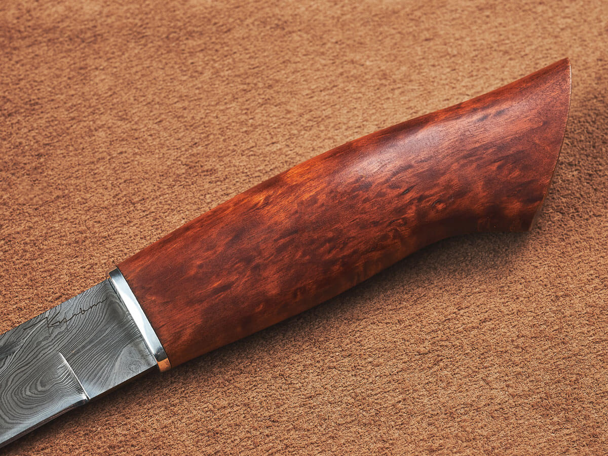 Дерево не скользит в мокрой ладони, брать его в руку удобно и приятно. Рисунок древесины всегда уникален и делает эксклюзивным каждый экземпляр ножа.