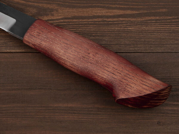 Рукоять хваткая, не скользит в мокрой ладони, брать ее в руку удобно и приятно. Рисунок древесины всегда уникален и делает эксклюзивным каждый экземпляр ножа.