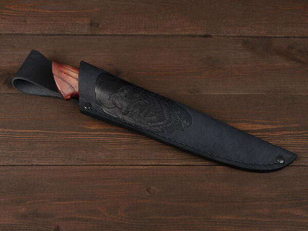 К изделию прилагаются ножны из толстой натуральной кожи с подвесом для ношения на поясе. Нож в таких ножнах плотно упакован, удобен в переноске, не вываливается и не болтается при тряске. Кожа окрашена в черный цвет, аккуратно прошита, хорошо держит форму и приятна на ощупь.