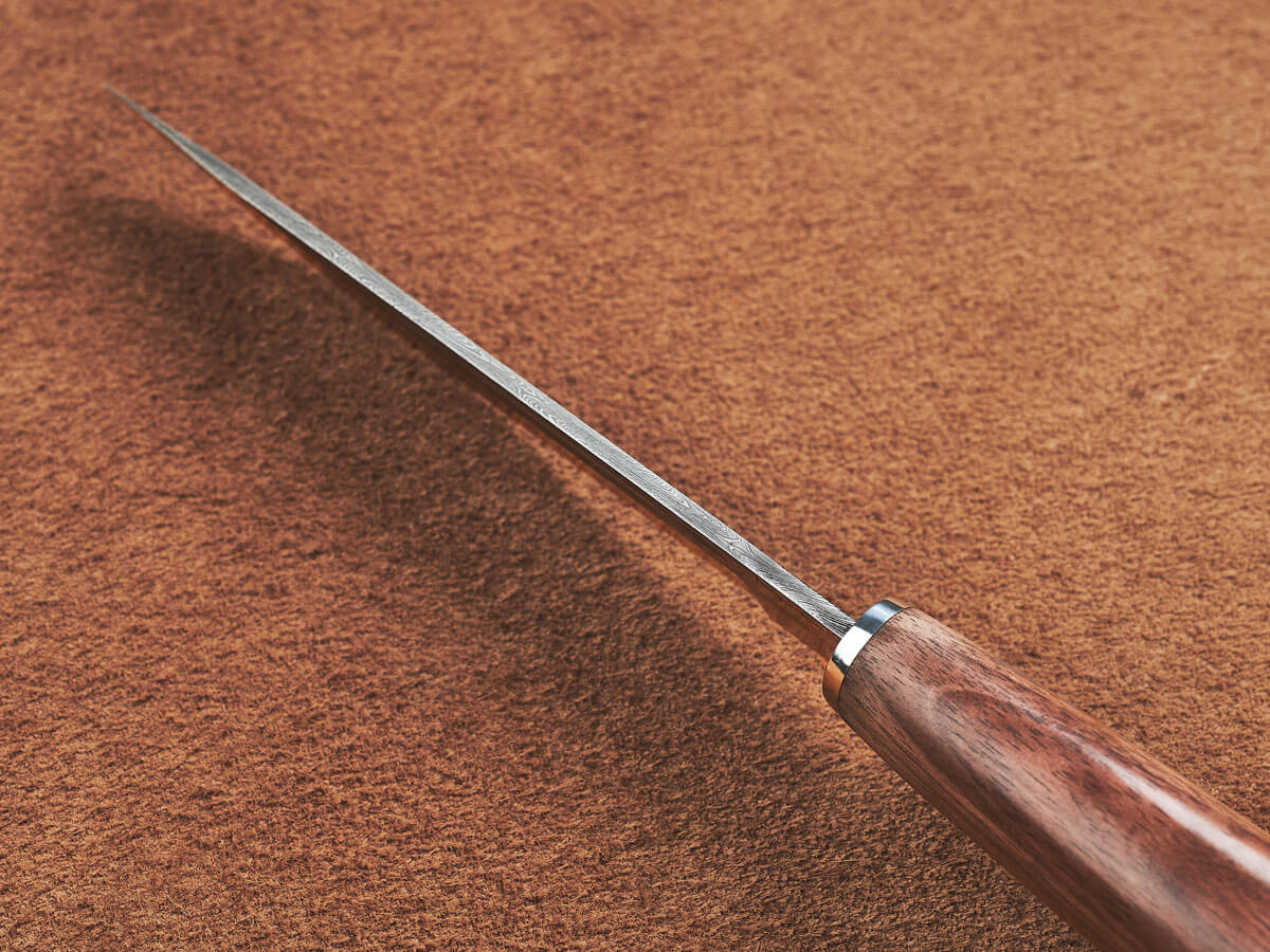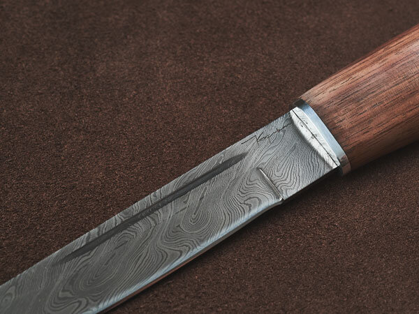 Клинок изготовлен из дамасской стали, что гарантирует его высокую прочность и исключительную остроту. Дамасская сталь не только крепче обычной, но и более износостойкая и декоративно более выигрышная за счет уникального узора. В основу поковки входят четыре марки качественной стали: У8А, ШХ-15, 5ХНМА и 45х13. Твердость клинка после закалки составляет 60 единиц HRC. Микро-подвод на лезвии максимально острый – 0,3 мм, а режущая кромка образует тончайшую микро-пилу благодаря тому, что в дамасской стали чередуются слои металла с низким и высоким содержанием углерода (всего таких слоев около 400).