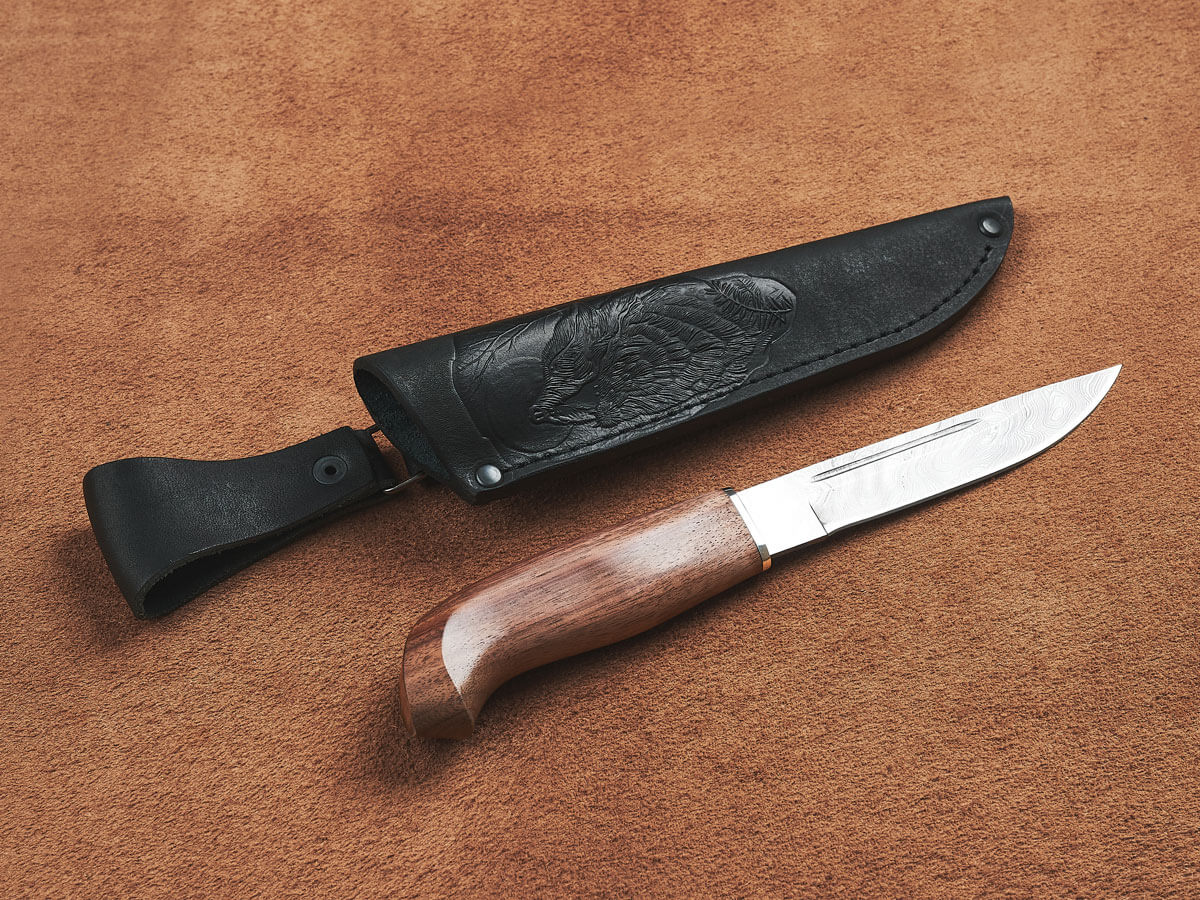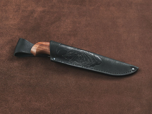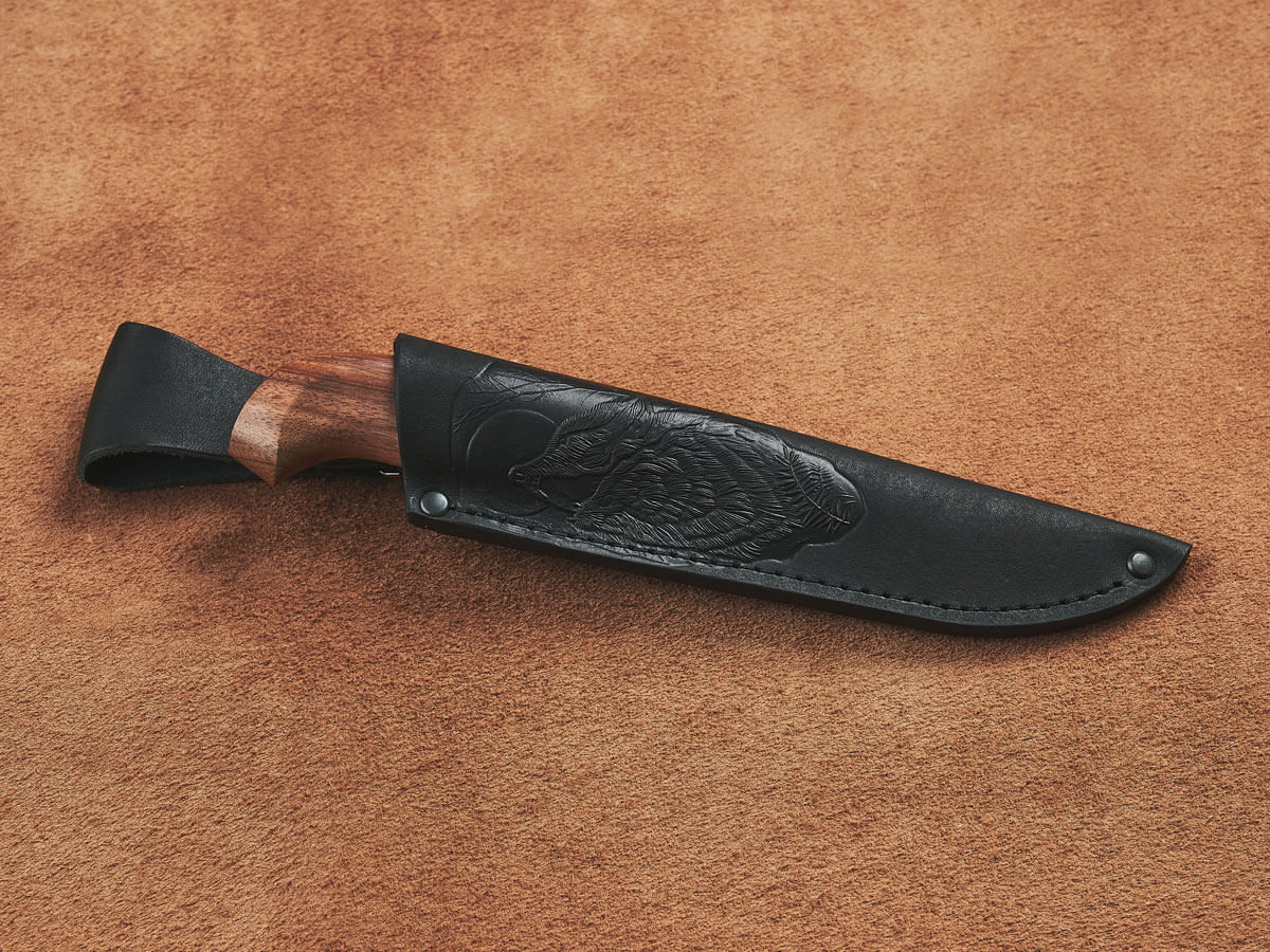 Нож оснащен элегантно изогнутой рукоятью из кавказского горного ореха – красивого и крепкого материала, который не боится влаги и холода, не рассыхается, не трескается на морозе и умеет держать тепло даже при отрицательной температуре.