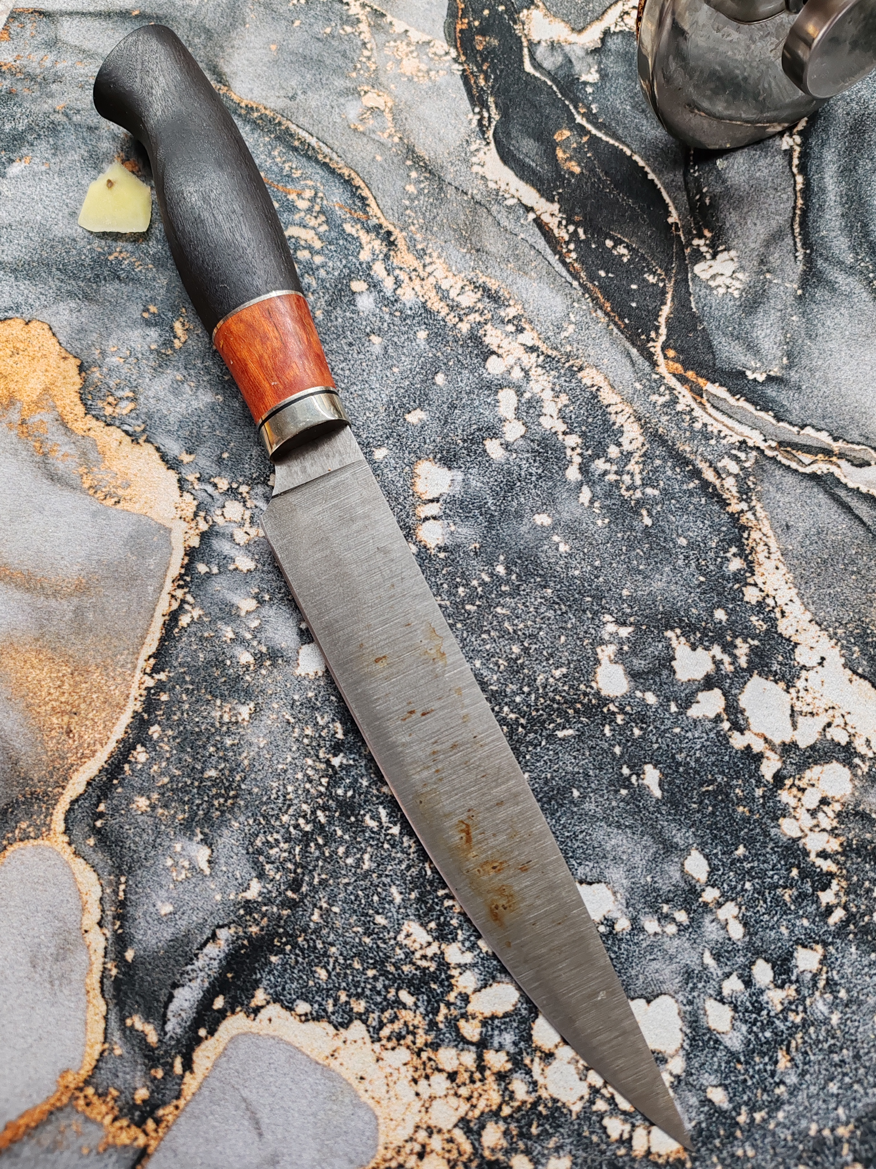 Каждый клинок дополнительно травится в растворе хлорного железа, в результате поверхность ножа приобретает благородный матово-серый тон, придавая изделию респектабельный и стильный вид. За счет такого способа травления можно определить, что перед вами действительно кованая сталь Х12МФ.