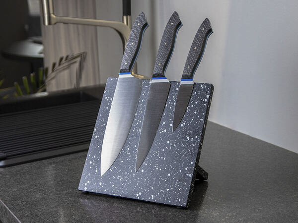 Прочная и устойчивая подставка снабжена мощными магнитами, которые надежно держат ножи на ее поверхности. Благодаря удобному вертикальному расположению ножи всегда будут под рукой и не затупятся от соприкосновения с другими приборами. Подставка имеет стильный внешний вид и гармонично впишется в ваш кухонный интерьер.