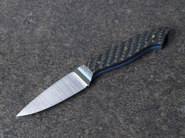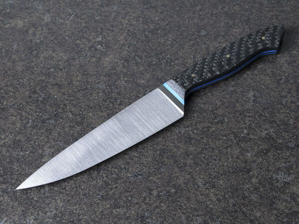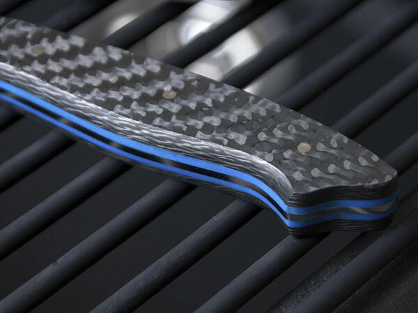 Рукоять составляет единое целое с клинком и снабжена удобными накладками, выполненными из карбона. Карбон – легкий и прочный материал, применяемый для изготовления рукоятей ножей премиум-класса.