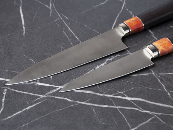 Этот узкий и легкий нож служит вторым универсалом и дополняет большой шеф в тех случаях, когда нужна более деликатная работа. Он идеально подходит для аккуратной нарезки готовых продуктов, таких как сыр, колбаса, мясные деликатесы. С его помощью можно легко отделить мякоть рыбы от хребта, быстро почистить овощи, подать красивыми кубиками фрукты, накрошить салат.