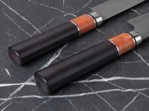 Клинки ножей выполнены из высокоуглеродистой кованой стали Х12МФ, что гарантирует отличный рез при высоких и длительных нагрузках. Х12МФ – прочная и износостойкая сталь. Клинки из такой стали долго держат заточку, поэтому ее широко используют в изготовлении охотничьих и кухонных ножей.