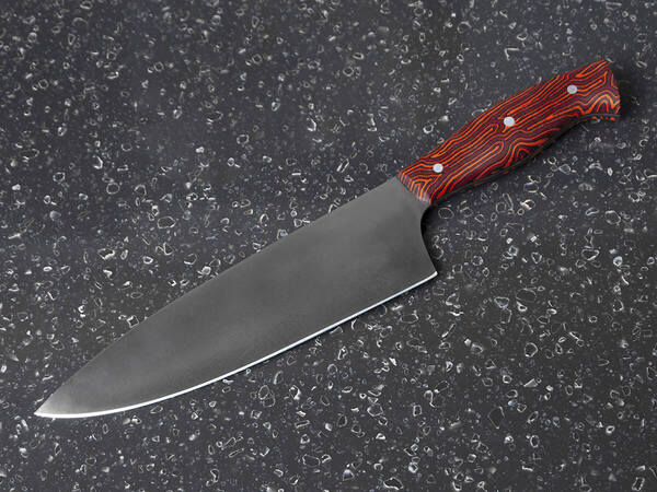 Каждый клинок дополнительно травится в растворе хлорного железа, в результате поверхность ножа приобретает благородный матово-серый тон, придавая изделию респектабельный и стильный вид. За счет такого способа травления можно определить, что перед вами действительно кованая сталь Х12МФ.