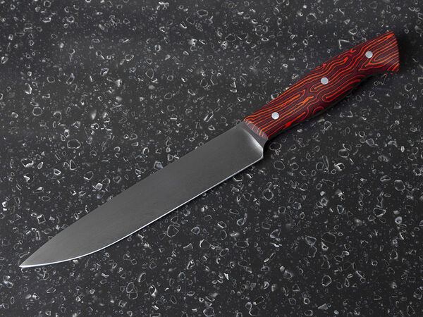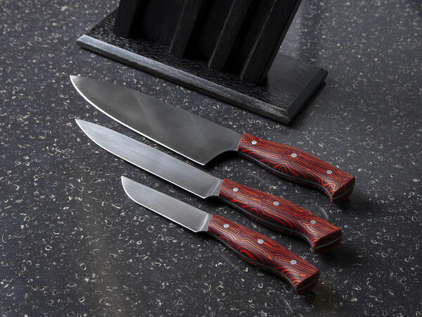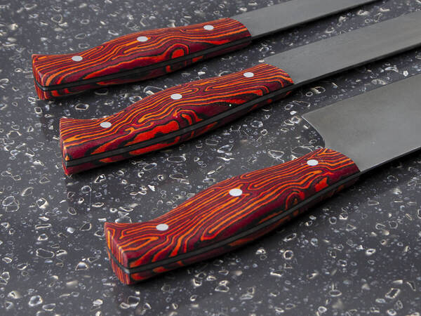 В наборе Profi Magma рукоять имеет насыщенный огненно-красный узор, напоминающий языки расплавленной магмы. Ножи с такими рукоятями станут ярким декоративным элементом и внесут в пространство вашей кухни жизнерадостную нотку.