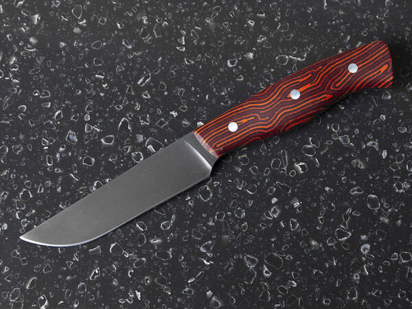 Рукоять составляет единое целое с клинком и снабжена удобными накладками, выполненными из микарты. Это чрезвычайно прочный и практичный материал из спрессованных слоев ткани, бумаги и льняного волокна, склеенных с помощью смолы.
