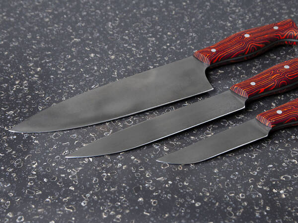 Клинки ножей выполнены из высокоуглеродистой кованой стали Х12МФ, что гарантирует отличный рез при высоких и длительных нагрузках. Х12МФ – прочная и износостойкая сталь. Клинки из такой стали долго держат заточку, поэтому ее широко используют в изготовлении охотничьих и кухонных ножей.