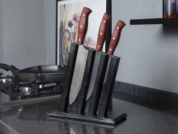 Вместе с комплектом ножей вы можете дополнительно приобрести прочную и удобную подставку из натуральной древесины. Подставка снабжена устойчивой опорой и индивидуальными слотами для каждого ножа. Благодаря удобному вертикальному расположению ножи всегда будут под рукой и не затупятся от соприкосновения с другими приборами.