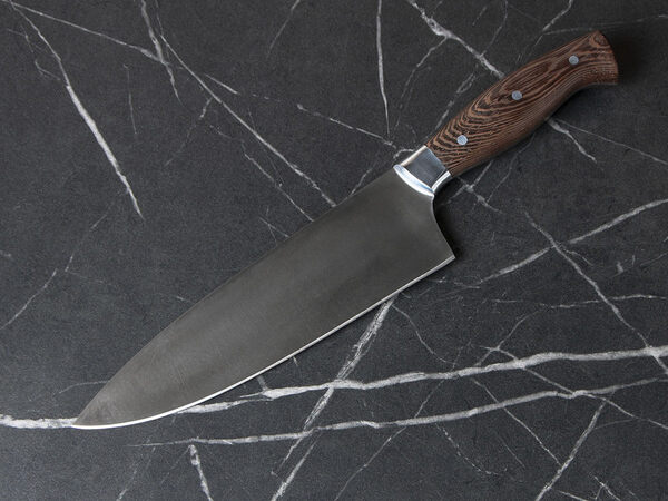 Каждый клинок дополнительно травится в растворе хлорного железа, в результате поверхность ножа приобретает благородный матово-серый тон, придавая изделию респектабельный и стильный вид. За счет такого способа травления можно определить, что перед вами действительно кованая сталь Х12МФ.